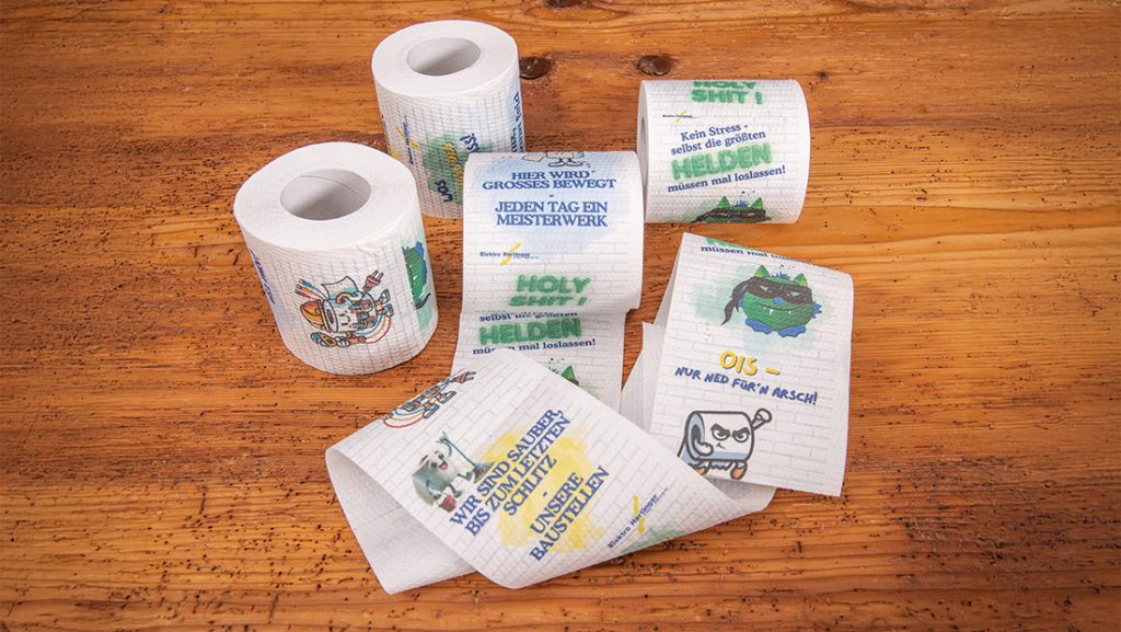 Auf Ausbildungsmessen konkurrieren inzwischen eine Vielzahl an Aussteller um die Aufmerksamkeit der Jugendlichen – ein Umfeld, in dem Standard-Werbemittel schnell untergehen. Die Aufgabe lautete also: Ein Werbemittel entwickeln, das auffällt, Gespräche initiiert und nachhaltig in Erinnerung bleibt. Die Lösung war ebenso mutig wie wirkungsvoll: bedrucktes Toilettenpapier – humorvoll, überraschend und absolut unwiderstehlich im Messekontext. Elektro Hartinger entschied sich – auf Empfehlung von werbemax – bewusst für ein ungewöhnliches Give-away, das sofort Aufmerksamkeit erregt. Das Ergebnis übertraf alle Erwartungen: Der Messestand war durchgehend stark besucht. Verschiedene Motive und freche Sprüche sorgten für hohe Begehrlichkeit. Die regionale Tageszeitung berichtete und kürte das Toilettenpapier zum kreativsten Werbemittel der Messe. Mit diesem unkonventionellen Ansatz gelang es Elektro Hartinger, sofort ins Gespräch zu kommen und wertvolle Erstkontakte aufzubauen.
