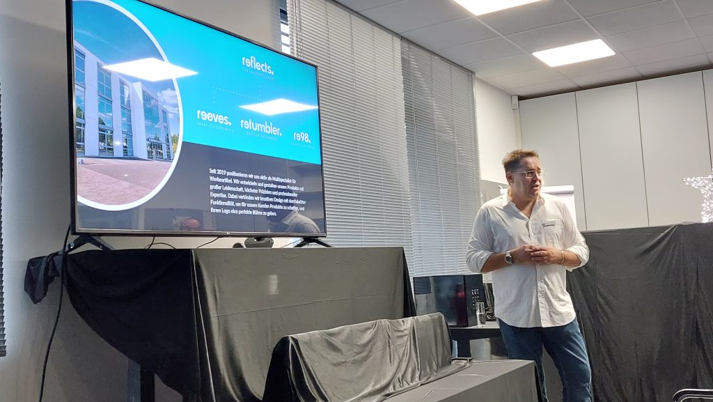 Die Neuheiten der Aussteller waren hier auf drei Etagen verteilt und sorgten für stetes wie reges Interesse der Fachbesucher. Gastgeber Reflects nutzte die Gelegenheit, die Qualitäten der Eigenmarken RETUMBLER®, REEVES® und RE98 eingehend nahe zu bringen. Unter dem Motto „Eine Idee wird in Form gegossen“ vermittelte Reflects-Geschäftsführer Meinhard Mombauer in anschaulichen Präsentationen den komplexen wie aufwändigen Entwicklungsprozess eines neuen Produkts aus der Markenserie des Unternehmens. Es handelt sich hierbei um eine innovative Sportflasche namens „DUIX“, die mit smarten Details beeindruckt und erst im kommenden März auf den Markt kommt. Alle Gäste, die in den Genuss dieses exklusiven Previews kamen, durften sich über ein Muster dieser Neuentwicklung freuen.